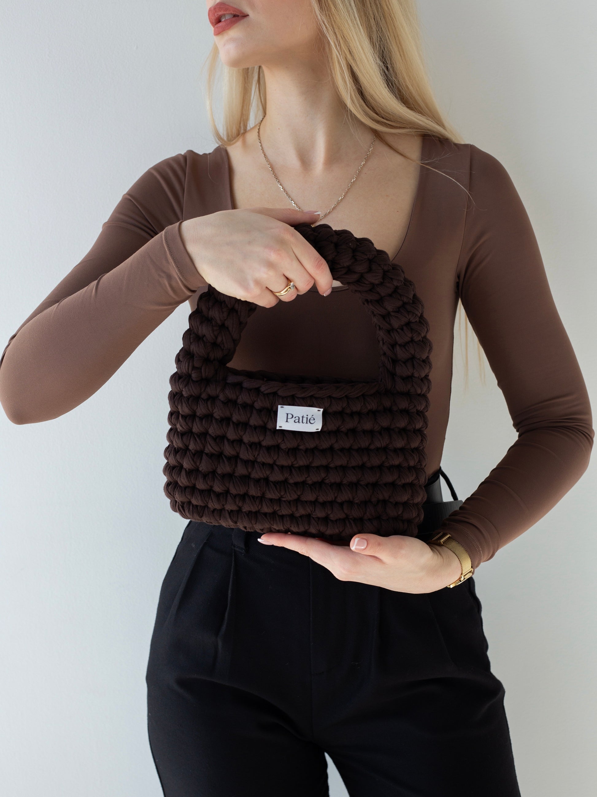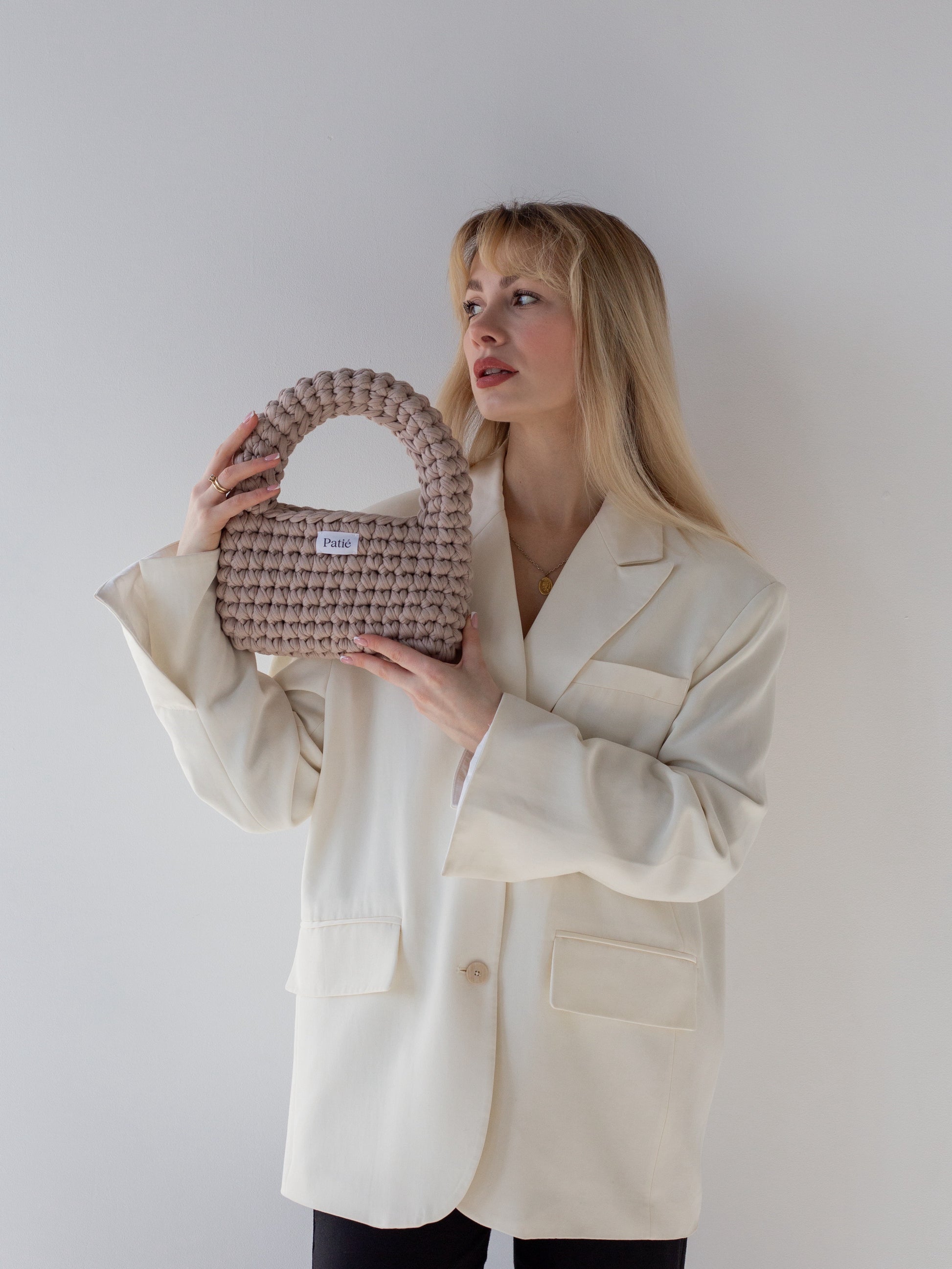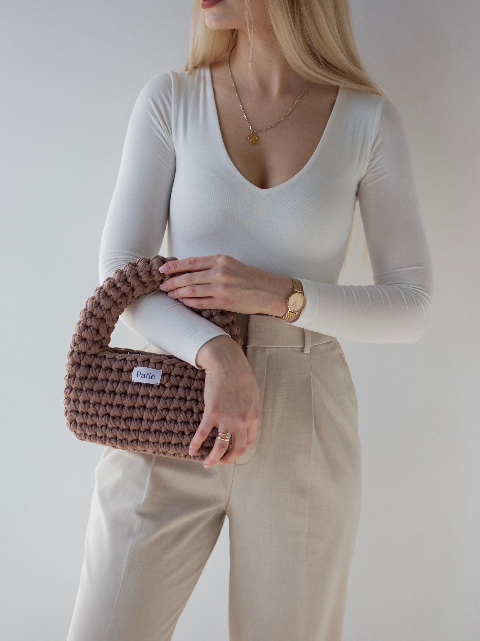 Model torebki Èlegance to elegancki wybór na każdą okazję. Zapewnia wygodę noszenia zarówno w dłoni, jak i na przedramieniu. Wykonana jest w 100% z wysokiej jakości włóczki bawełnianej, produkowanej w Polsce. Jest to model, który nigdy nie wyjdzie z mody, a jego ponadczasowy design stanowi idealne dopełnienie zarówno codziennych, jak i bardziej eleganckich stylizacji. Całość wykonana jest ręcznie, z dbałością o każdy detal.